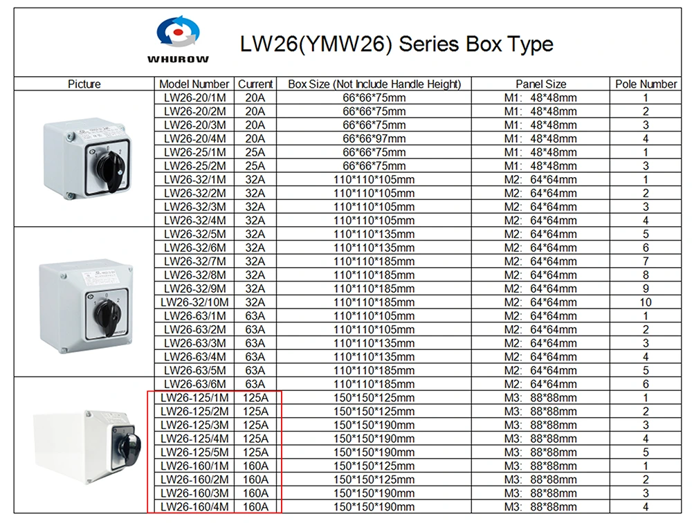 YAMING, doświadczony producent z ponad 30-letnim doświadczeniem w produkcji przełączników elektrycznych, przedstawia wodoodporny przełącznik krzywkowy LW26 125A 160A (model wewnętrzny: YMW26-125M 160M) wyposażony w wodoodporną obudowę. Charakteryzuje się doskonałą możliwością dostosowania do różnorodnych warunków pracy, wszechstronnymi funkcjami i wysokim poziomem bezpieczeństwa, co czyni go idealnym wyborem do sterowania obwodami, sterowania silnikiem, sprzętu testowego i głównych scenariuszy sterowania.