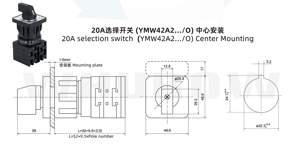 - Elastyczna konfiguracja pozycji i warstw: 20A, montowany w otworze środkowym, wydłużający wiele pozycji Przełącznik krzywkowy obsługuje do 12 pozycji roboczych i od 1 do 12 warstw przełączników, które można dostosować do rzeczywistych potrzeb sprzętu, aby spełnić złożone scenariusze sterowania.