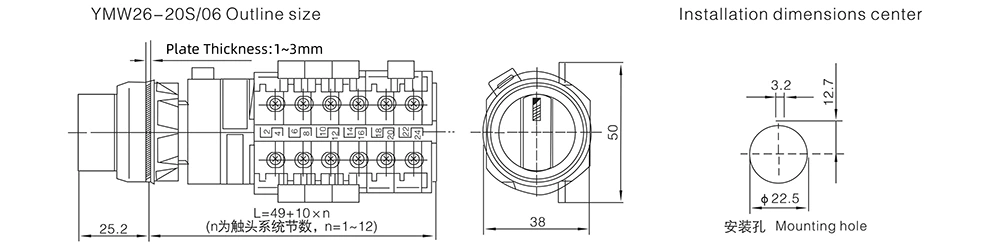Przełącznik krzywkowy 20A do montażu centralnego z jednym otworem jest krystalizacją lat doświadczeń firmy YAMING w zakresie innowacji technologicznych i doświadczenia produkcyjnego. Oprócz podstawowego przełącznika obrotowego został on zaprojektowany tak, aby zapewnić płynną i niezawodną kontrolę i konwersję obwodów, służąc jako podstawowy element poprawiający wydajność sterowania przemysłowego i wydajność sprzętu. Przełącznik przyjmuje konstrukcję z centralnym otworem i aperturą 22,5 mm, co ułatwia szybki i wygodny montaż w różnych panelach urządzeń.