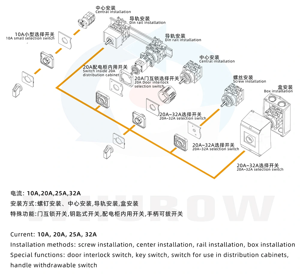 Przełącznik krzywkowy YAMING 63A ON-OFF-ON z podwójnym sterowaniem zasilaniem (model wewnętrzny: YMW42-63) to wysokowydajny przełącznik krzywkowy z podwójnym zasilaniem, starannie wykonany przez firmę Zhejiang Yaming Electric Co., Ltd. w oparciu o ponad 30-letnie doświadczenie w badaniach, rozwoju i produkcji przełączników elektrycznych. Jako fabryka specjalizująca się w przełącznikach elektrycznych, YAMING konsekwentnie stawia na najwyższą jakość wykonania i zaawansowaną technologię jako swoje podstawowe kompetencje. Ten przełącznik krzywkowy stanowi skoncentrowane ucieleśnienie siły marki, którego celem jest dostarczanie niezawodnych i wydajnych rozwiązań do różnych zadań związanych ze sterowaniem obwodami elektrycznymi, pomagając poprawić stabilność działania i bezpieczeństwo sprzętu elektrycznego.